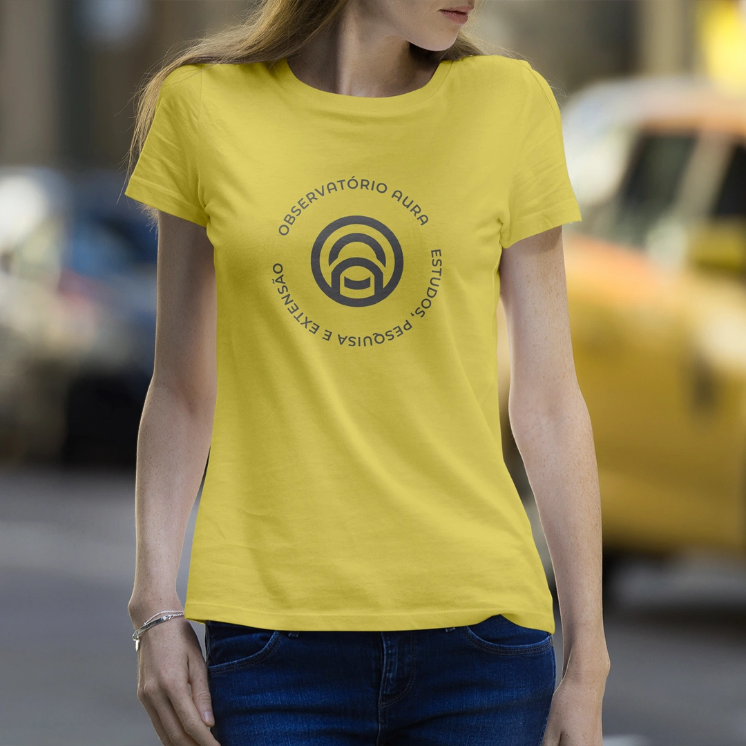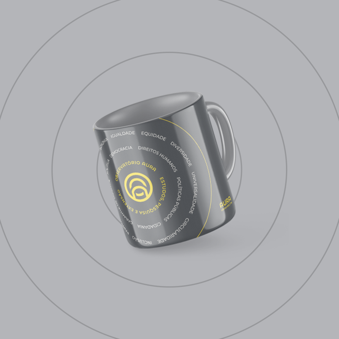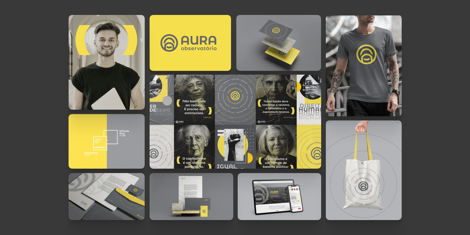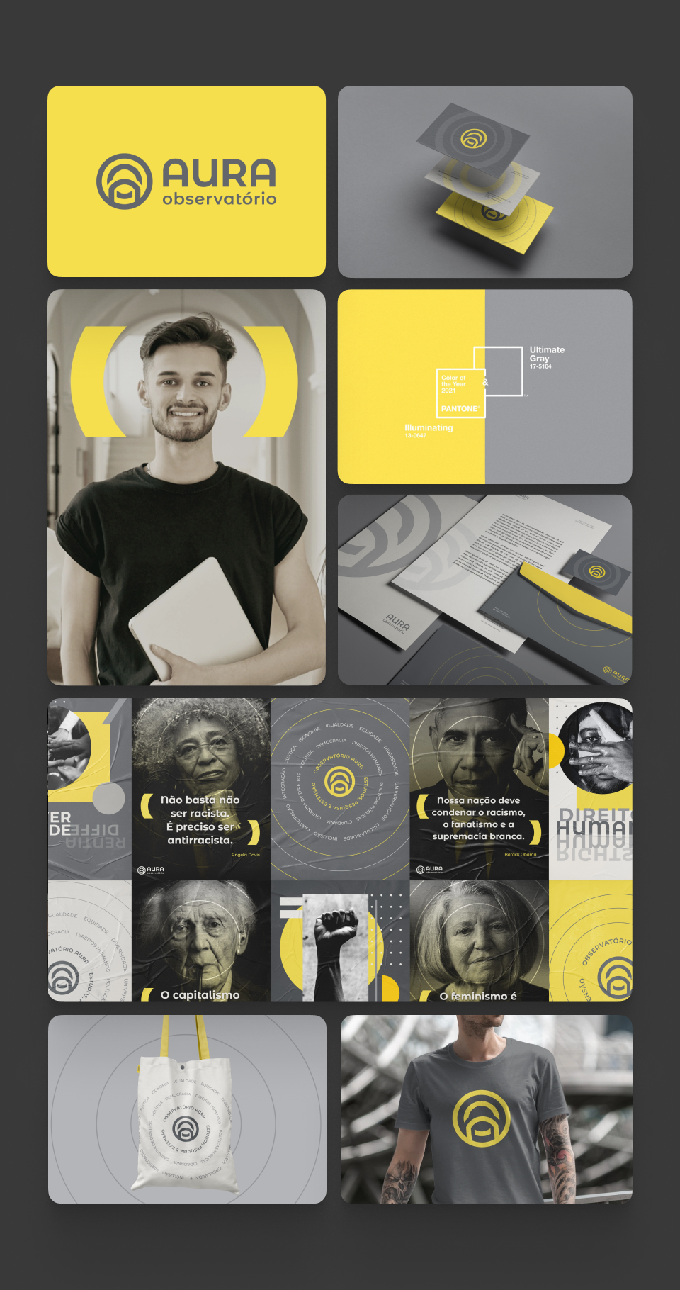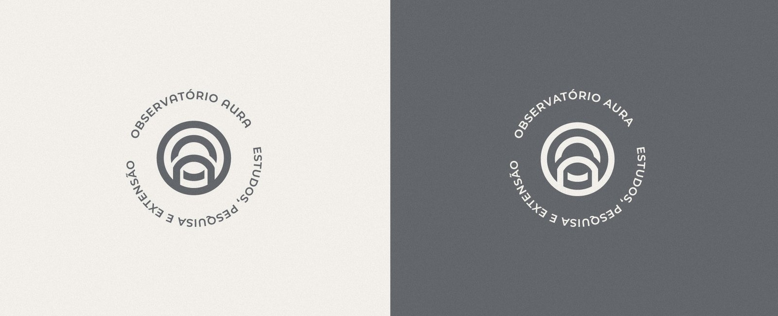O símbolo do Observatório Aura remete à circularidade democrática, representando o movimento constante de construção e reconstrução social. A aplicação da proporção áurea reforça equilíbrio e harmonia, enquanto a paleta em amarelo vibrante e cinza sólido transmite resiliência, esperança, estabilidade e seriedade.